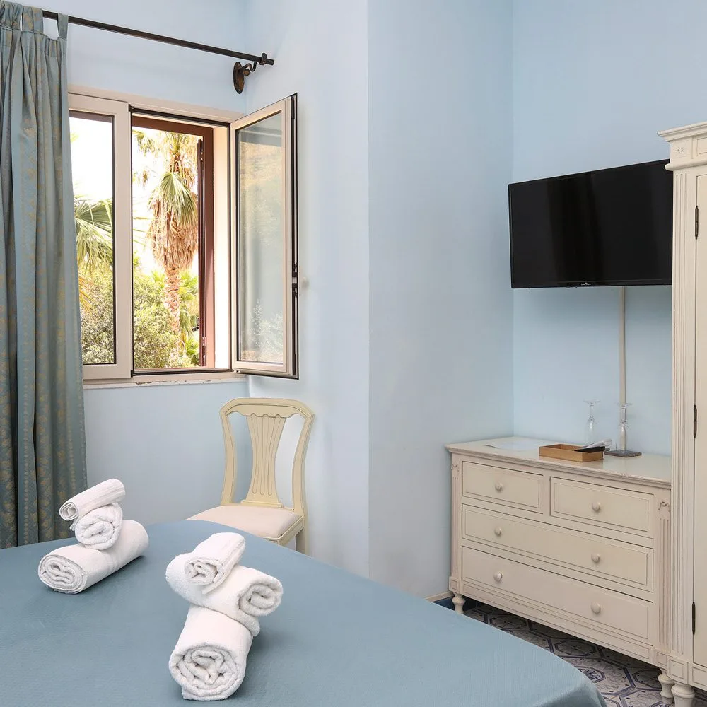 Camere ampie e luminose in stile classico. Tutte con terrazzo privato e affaccio sui giardini mediterranei.